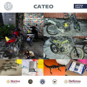 Ahí, el agente del Ministerio Público (MP) con apoyo de personal de la Coordinación de Servicios Periciales aseguraron un bolsa con hierba verde seca con características de la marihuana, chips de celular, un artefacto para expulsar proyectiles, una báscula, municiones, cinco motocicletas desvalijadas y dos caimanes vivos en bandejas con agua.
