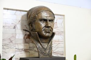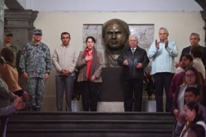Posteriormente, Margarita González Saravia, junto con integrantes de su gabinete legal y ampliado, autoridades, federales, estatales y municipales, realizó el corte simbólico de listón en la nueva ubicación del busto del el “Siervo de la Nación”, en la parte superior de la escalinata del Palacio de Gobierno.