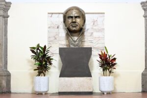 La titular del Poder Ejecutivo, Margarita González Saravia, realizó el corte simbólico de listón en la nueva ubicación del busto del el “Siervo de la Nación”, en la parte superior de la escalinata del Palacio de Gobierno