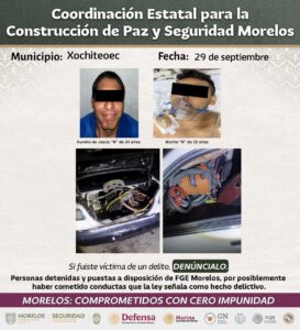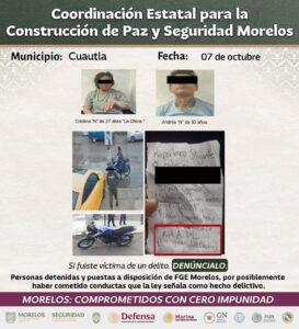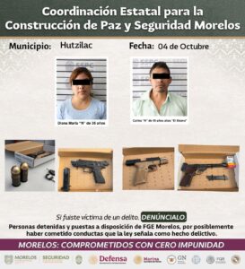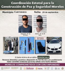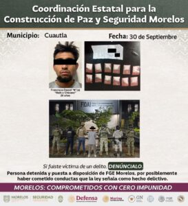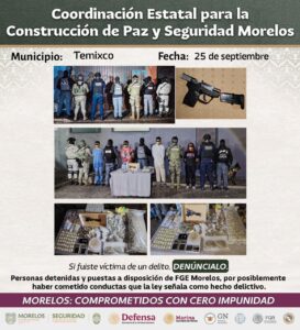 En este sentido, expresó que del 25 de septiembre al 07 de Octubre, se realizaron diversos operativos interinstitucionales, así como órdenes de cateo y de aprehensión en las regiones metropolitana de Cuernavaca, oriente, sur y sur poniente de la entidad, donde participaron: SSPC Morelos, Secretaría de la Defensa Nacional (Defensa), Guardia Nacional (GN), Secretaría de Marina (Semar), Fiscalía General del Estado (FGE) Morelos, Secretaría de Seguridad y Protección Ciudadana federal, así como Fiscalía General de la República (FGR).