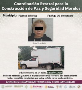 Derivado del operativo “Tecatl” contra robo de vehículo y motocicleta, en el municipio de Puente de Ixtla fue detenida Erika “N” de 49 años, a quien le aseguró una camioneta Nissan Tipo NP-300, color blanca con cabina, con placas de circulación de Michoacán, la cual fue robada con violencia el pasado 10 de septiembre en Lagunas de Zempoala, en el municipio de Huitzilac.